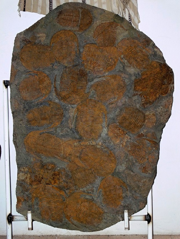 The name, trilobite, comes from the three distinct portions of their segmented body. The hard exoskeleton allowed good preservation as a fossil and served as defensive armor, but had to be shed periodically as the animal grew. These many legged arthropods roamed the sandy bottoms of the seas and coral reefs in search of food.