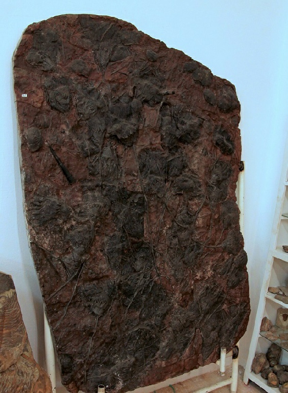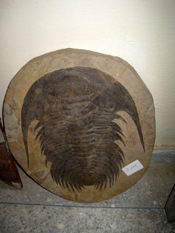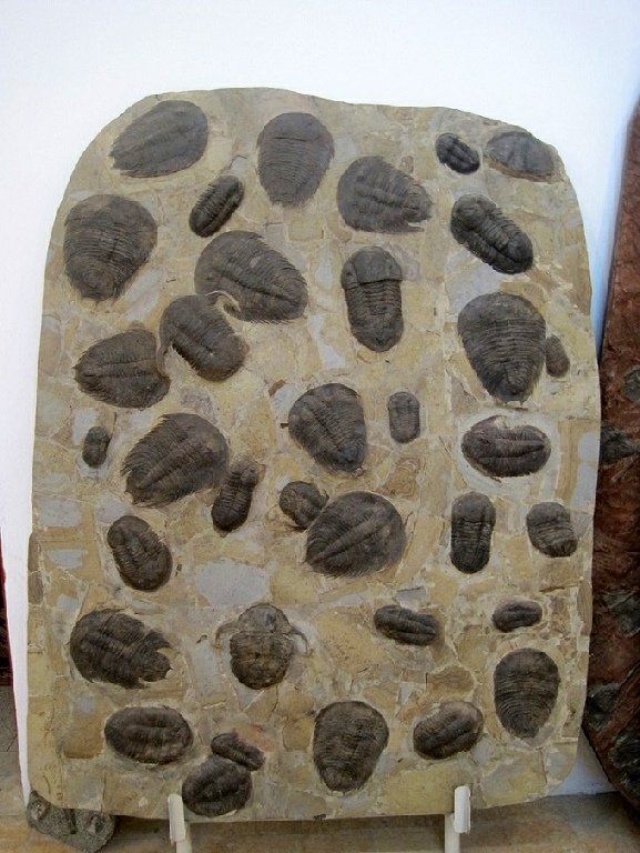 The name, trilobite, comes from the three distinct portions of their segmented body. The hard exoskeleton allowed good preservation as a fossil and served as defensive armor, but had to be shed periodically as the animal grew. These many legged arthropods roamed the sandy bottoms of the seas and coral reefs in search of food.